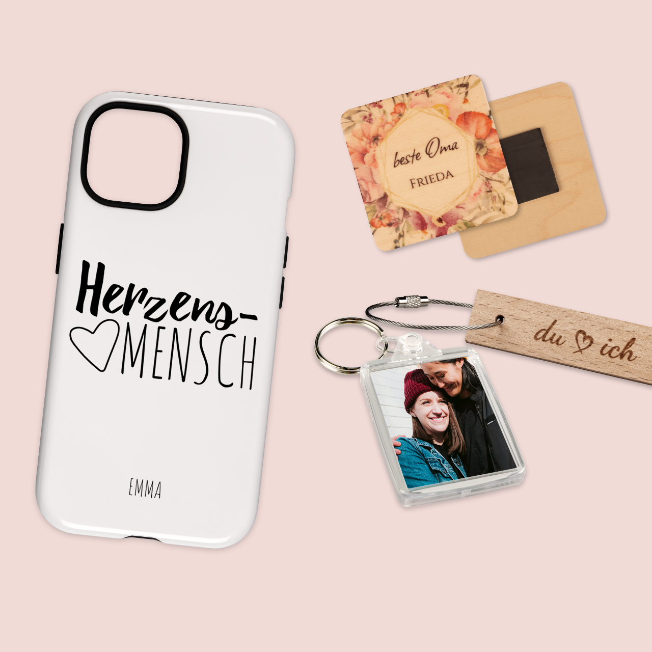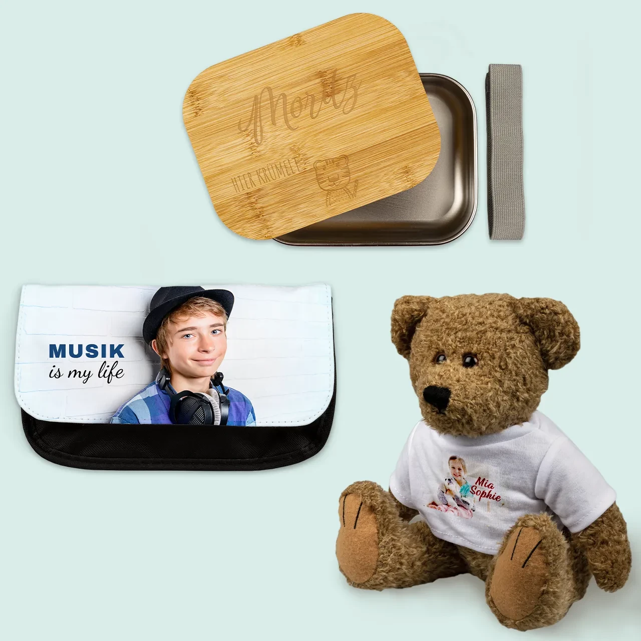 Für Kinder gibt es individuelle Geschenke, wie Brotdosen, Turnbeutel oder Kuscheltiere mit eigenem Foto. Erwachsene freuen sich u. a. über personalisierte Tassen, Kissen oder Handyhüllen.